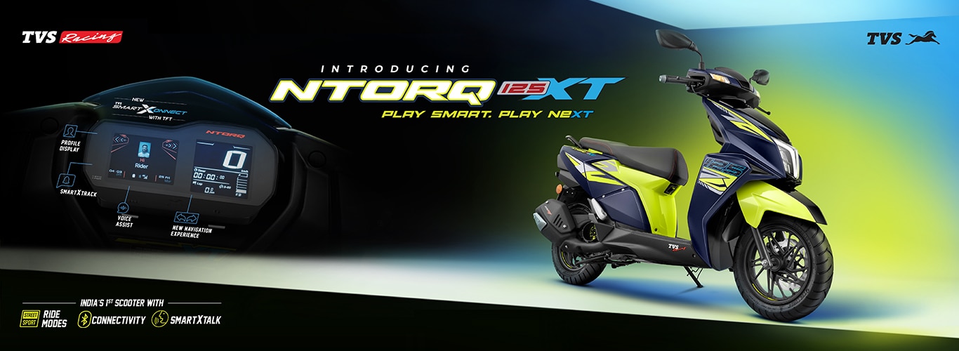 BEHOLD THE NEW TVS NTORQ 125 OPEN YOUR SENSES TO A REVOLUTIONARY RIDING EXPERIENCE TAKE OFF WITH THE 125 3-VALVE CVTi REVV ENGINE CONQUER THE ROADS WITH THE STEALTH AIRCRAFT INSPIRED DESIGN INDIA’S FIRST CONNECTED SCOOTER